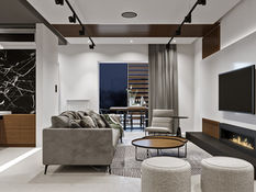 The living room features a small, cozy fireplace, serving as a focal point for relaxation and warmth during chilly evenings. Cleverly integrated atmospheric lighting enhances the ambiance, highlighting architectural features and creating a welcoming glow throughout the apartment.