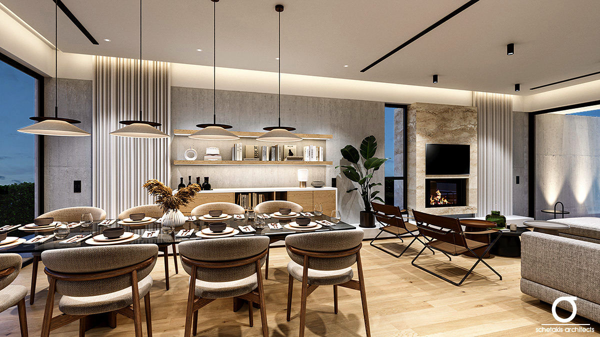 The use of travertine in both the fireplace and kitchen island infuses a sense of luxury, bridging the contemporary with the timeless. This project not only highlights the beauty of simplicity but also creates a harmonious living environment that celebrates the charm of Chania’s coastal lifestyle.